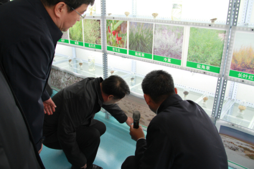 在蒙草北方植物種質資源庫中,聽取王召明關于存儲植物種子、土壤環(huán)境、水文情況等介紹